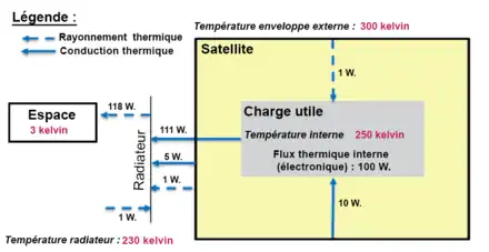 Les objets célestes comme la Terre sont en équilibre thermique, c'est-à-dire que la chaleur qu'ils renvoient dans l'espace est à peu près identique à celle qu'ils reçoivent (la chaleur générée par les éléments radioactifs présents à l'intérieur de la planète peuvent être négligés). L'énergie qui n'a pas été réfléchie par la planète (voir Albédo) est renvoyée dans l'espace sous la forme d'un rayonnement infrarouge. Contrairement à l'énergie réfléchie, qui n'est produite que par la face éclairée de la planète, ce rayonnement infrarouge est homogène sur toute la surface et donc également émis par la face non éclairée. Ces deux types de flux thermique, qui décroissent comme le carré de l'altitude, deviennent faibles à quelques milliers de kilomètres d'altitude et quasi nuls au niveau de l'orbite géostationnaire[9]. Le flux solaire émis est équivalent à celui d'une sphère dont la température serait d'environ −18 °C. Ce flux est émis dans l'infrarouge moyen entre 10 et 12 micromètres. Pour calculer le flux thermique reçu par un satellite orbitant à la limite de l'atmosphère terrestre, on utilise la valeur de 237 W/m2 au niveau de la surface de la Terre. La formule de calcul est :