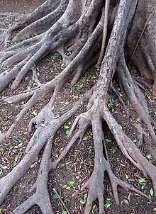 Ce sont souvent de grandes et larges racines de tous les côtés d'un arbre peu enraciné. En règle générale, les contreforts se trouvent dans des sols forestiers tropicaux pauvres en éléments nutritifs et qui peuvent ne pas être très profonds. Ils empêchent l'arbre de s'effondrer (d'où le nom de contrefort) tout en recueillant davantage d'éléments nutritifs. Les contreforts sont des éléments de tension, étant plus larges du côté opposé à la tension occasionnée par une ramure (canopée) asymétriques[2]. Les racines peuvent se croiser avec les contreforts d’autres arbres et créer un maillage complexe qui peut aider à soutenir un ensemble d'arbres contigus. Les contreforts peuvent atteindre 30 pieds (9,144 m) de haut et être étalés sur 30 mètres au-dessus du sol (above the soil), puis sur 30 mètres plus bas (below) (?). Lorsque les racines se propagent horizontalement, elles peuvent couvrir une zone plus vaste pour la collecte des nutriments. Les racines restent près de la couche supérieure du sol car tous les nutriments principaux y sont présents[3]