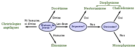 Après Éphèse, en contestation des thèses de Nicée, certains théologiens alexandrins élaboreront le monophysisme (de monos, « unique », et physis, « nature »), personnifié par le moine Eutychès qui, développant la formulation de Cyrille d'Alexandrie[n 3], propose une solution à la question de la nature du Christ. Il y voit deux natures mais une seule volonté, celle de Dieu. Accusé d’hérésie, il maintient que le Christ n'a qu'une nature, la nature divine, par laquelle a été absorbée la nature humaine « comme une goutte d'eau l'est par la mer » après l'Incarnation. On retrouve cette idée dans le miaphysisme de l'église apostolique arménienne.