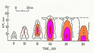 Par contre, les forts mouvements verticaux, dans et autour des orages, sont à éviter car ils peuvent produire de la turbulence intense. Cependant, les ascendances à l'avant d'un orage peuvent être extrêmement douces et modérées. Ces conditions sont d'autant plus dangereuses à cause du sentiment de fausse sécurité qu'elles procurent, car elles peuvent dégénérer en très peu de temps[10]. De plus, le givrage dans ces nuages est important, car les gouttes y sont en surfusion. De nombreux avions se sont écrasés à la suite d'un givrage extrêmement rapide des surfaces portantes. Quoique rare, la foudre peut aussi frapper les aéronefs et la grêle peut endommager voire détruire un aéronef[11],[12].