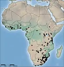 Cette espèce se rencontre en Afrique subsaharienne[1] ; de la Sierra Leone à l'Éthiopie et à l'Afrique du Sud[2].