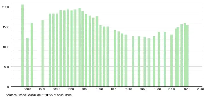 L'évolution du nombre d'habitants est connue à travers les recensements de la population effectués dans la commune depuis 1793. Pour les communes de moins de 10 000 habitants, une enquête de recensement portant sur toute la population est réalisée tous les cinq ans, les populations légales des années intermédiaires étant quant à elles estimées par interpolation ou extrapolation[22]. Pour la commune, le premier recensement exhaustif entrant dans le cadre du nouveau dispositif a été réalisé en 2008[23].