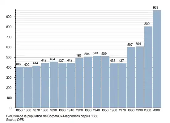 Le graphique suivant résume l'évolution de la population de Corpataux-Magnedens entre 1850 et 2008[3] :
