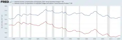 Mesurée par rapport au PIB, la rémunération totale et sa composante salaires et traitements sont en baisse depuis 1970. Cela indique un transfert de revenu du travail (personnes tirant un salaire horaire) vers le capital (personnes tirant un revenu de la propriété d'une entreprise, de terres et de biens)[16].