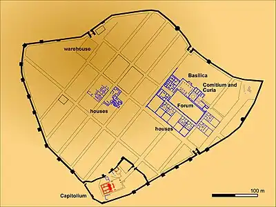 Cette disparité sensible entre les deux parties de la ville correspond la nature des édifices qu’elles accueillent. En effet, la partie nord de la ville semble affectée essentiellement à l’habitat, comme en témoignent les deux maisons fouillées de part et d’autre de la rue « M ». Il faut néanmoins signaler la présence d’un grenier à blé (horreum), au sud de la porte nord-ouest, ainsi que d’un possible petit temple qui lui fait pendant de l’autre côté de cette porte. La partie sud de la ville accueille quant à elle les principaux édifices publics de la ville, bien que le caractère circonscrit des fouilles ne permette pas de préciser la destination de tous ses îlots. Au sud-est se trouve le forum, centre institutionnel de la ville. Il se présente sous la forme d’une vaste place rectangulaire bordée sur trois de ses côtés par un portique continu. Le côté restant, au nord-est, est occupé par une série de bâtiments publics. Au nord se trouve une basilique, édifice rectangulaire servant de lieu de rassemblements, surtout pour les procès[2]. Au centre, la curie et le comitium, qui abritent respectivement les réunions du Sénat local et celles des assemblées populaires (les comices). Ce comitium se présente sous la forme de gradins aménagés en cercle, comme à Rome. Un temple rectangulaire et monté sur podium, dédié à la Concorde, est accolé à cet ensemble au sud[2]. Enfin, on reconnaît à l’angle sud-est un petit bâtiment rectangulaire correspondant vraisemblablement à la prison. Séparé du forum par un vaste îlot, le capitole est installé sur une éminence, dans l’angle sud-ouest de l’enceinte. Il s’agit du principal temple de la ville, dédié à la triade capitoline[2], c’est-à-dire aux trois dieux tutélaires de Rome : Jupiter, Junon et Minerve. De forme rectangulaire, ce temple comportait donc vraisemblablement une triple cella, correspondant aux trois divinités qui y étaient honorées. Un autre petit temple se trouve au nord-est du capitole. Notons que ce quartier présente une orientation discordante par rapport au reste de la ville, et qu’il est délimité par une enceinte interne.