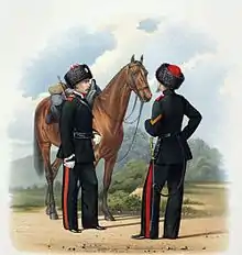 Les cosaques de Sibérie portent traditionnellement des bandes de pantalon, des pattes d’épaule et des casquettes à bandeaux vermeils sur un uniforme vert olive[2].