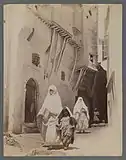 Toutefois, le costume des Constantinoises, semble plus statique que celui de la capitale. La chemise de dessous, avec ses manches enrichies de dentelles, la djoubba ou gandoura unie ou bicolore, la chéchia pointue et la majorité des composantes vestimentaires et des bijoux maintiennent leurs formes anciennes[55]. Seul le caftan fait exception puisqu'il s'allège et s'inspire du modèle algérois et devient la pièce la plus prestigieuse[57]. Les broderies apparaissent sur une panoplie de coiffes, voiles, voilettes, foulards, mouchoirs, écharpes et étoles[58]. Parmi les pièces brodées, le voile nuptial, appelé abrouq, conserve un statut privilégié, il est déposé sur la pointe de la chéchia conique qui est posée sur un fichu soyeux blanc, la meherma[58]. Cette chechia était inclinée et recouverte de sultanis ou de louis d'or[59].