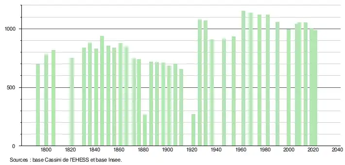 L'évolution du nombre d'habitants est connue à travers les recensements de la population effectués dans la commune depuis 1793. Pour les communes de moins de 10 000 habitants, une enquête de recensement portant sur toute la population est réalisée tous les cinq ans, les populations légales des années intermédiaires étant quant à elles estimées par interpolation ou extrapolation[22]. Pour la commune, le premier recensement exhaustif entrant dans le cadre du nouveau dispositif a été réalisé en 2008[23].
