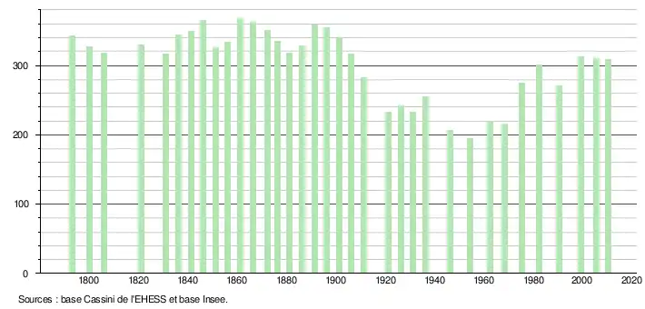 L'évolution du nombre d'habitants est connue à travers les recensements de la population effectués dans la commune depuis 1793. À partir du , les populations légales des communes sont publiées annuellement dans le cadre d'un recensement qui repose désormais sur une collecte d'information annuelle, concernant successivement tous les territoires communaux au cours d'une période de cinq ans. Pour les communes de moins de 10 000 habitants, une enquête de recensement portant sur toute la population est réalisée tous les cinq ans, les populations légales des années intermédiaires étant quant à elles estimées par interpolation ou extrapolation[13]. Pour la commune, le premier recensement exhaustif entrant dans le cadre du nouveau dispositif a été réalisé en 2005[14],[Note 2].