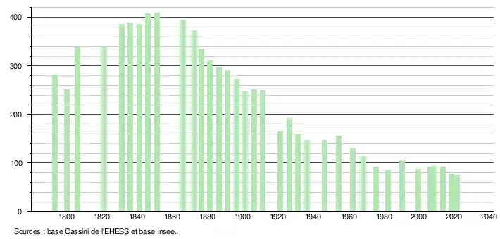 L'évolution du nombre d'habitants est connue à travers les recensements de la population effectués dans la commune depuis 1793. Pour les communes de moins de 10 000 habitants, une enquête de recensement portant sur toute la population est réalisée tous les cinq ans, les populations légales des années intermédiaires étant quant à elles estimées par interpolation ou extrapolation[17]. Pour la commune, le premier recensement exhaustif entrant dans le cadre du nouveau dispositif a été réalisé en 2008[18].