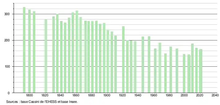 L'évolution du nombre d'habitants est connue à travers les recensements de la population effectués dans la commune depuis 1793. Pour les communes de moins de 10 000 habitants, une enquête de recensement portant sur toute la population est réalisée tous les cinq ans, les populations légales des années intermédiaires étant quant à elles estimées par interpolation ou extrapolation[22]. Pour la commune, le premier recensement exhaustif entrant dans le cadre du nouveau dispositif a été réalisé en 2005[23].