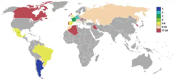 - Le nombre définitif de places allouées à l'UEFA (13 ou 14) et à l'OFC (0 ou 1) dépend du résultat du barrage intercontinental entre ces deux zones : le représentant européen, l’Écosse, bat le représentant océanien, l’Australie.