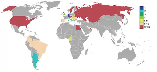 - Le nombre définitif de places allouées à la CONMEBOL (3 ou 4) et à l'OFC (0 ou 1) dépend du résultat du barrage intercontinental entre ces deux zones : le représentant sud-américain, la Colombie, bat le représentant « océanien », Israël (jouant en zone océanienne et non asiatique pour raison politique).