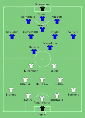Toujours aussi réaliste et bien organisée, la sélection allemande se hisse en finale pour la troisième fois d'affilée et remporte sa troisième Coupe du monde (après 1954 et 1974) en prenant sa revanche contre l'Argentine, alors que son pays vit la réunification. Dépité après l'élimination des siens en demi-finale par l'Allemagne[2], le capitaine anglais Gary Lineker livre alors cette savoureuse définition du football : « Le football est un sport simple : 22 hommes courent après un ballon pendant 90 minutes, et à la fin, c'est l'Allemagne qui gagne. »