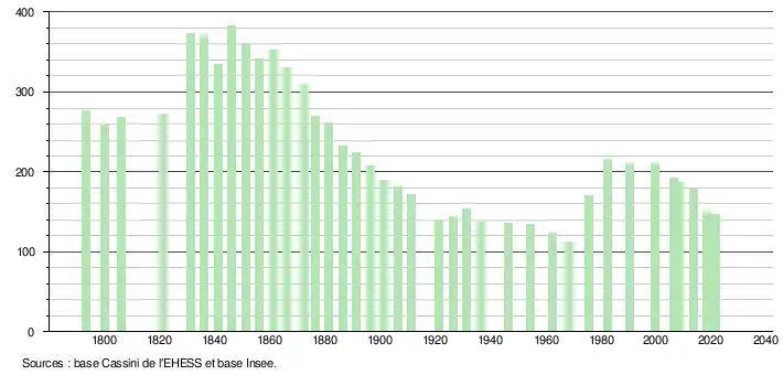 L'évolution du nombre d'habitants est connue à travers les recensements de la population effectués dans la commune depuis 1793. Pour les communes de moins de 10 000 habitants, une enquête de recensement portant sur toute la population est réalisée tous les cinq ans, les populations légales des années intermédiaires étant quant à elles estimées par interpolation ou extrapolation[15]. Pour la commune, le premier recensement exhaustif entrant dans le cadre du nouveau dispositif a été réalisé en 2008[16].