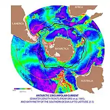 Le courant circumpolaire antarctique (aussi nommé Grande dérive d'Ouest) est le courant marin de l'océan Austral qui coule d'ouest en est autour de l'Antarctique. Il est issu de l'ouverture du passage de Drake il y a environ 33 millions d'années[1], consacrant la séparation définitive de l'Antarctique de l'Amérique du Sud. Cette ouverture a eu des implications majeures, induisant un refroidissement global du climat, ainsi que la formation d'une calotte polaire pérenne sur l'Antarctique.