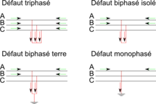 - défaut monophasé : une phase est reliée au neutre ou à la terre (80 % des cas). Sur une ligne à haute tension, ce type de défaut est fréquemment causé par la foudre qui initie un court-circuit entre une phase et la terre.