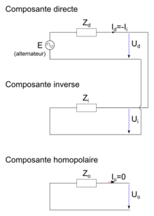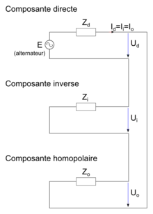 L'impédance directe et inverse de tous les composants électriques à l'exception des machines tournantes étant identiques, il est possible d'écrire On peut réécrire . En remplaçant E on obtient :