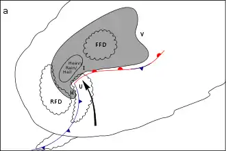 Le courant descendant du flanc arrière (RFD dans l'image) se trouve à la bordure arrière du nuage, là où de l'air frais et sec de l'environnement entre dans ce dernier. Comme il est près du courant ascendant (U) dans le nuage, il peut entrer en interaction avec celui-ci et donner une tornade[1]. Le courant descendant avant (FFD) est associé avec les précipitations de l'orage et la goutte froide[2].