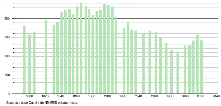 L'évolution du nombre d'habitants est connue à travers les recensements de la population effectués dans la commune depuis 1793. Pour les communes de moins de 10 000 habitants, une enquête de recensement portant sur toute la population est réalisée tous les cinq ans, les populations légales des années intermédiaires étant quant à elles estimées par interpolation ou extrapolation[17]. Pour la commune, le premier recensement exhaustif entrant dans le cadre du nouveau dispositif a été réalisé en 2005[18].