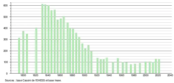 L'évolution du nombre d'habitants est connue à travers les recensements de la population effectués dans la commune depuis 1793. Pour les communes de moins de 10 000 habitants, une enquête de recensement portant sur toute la population est réalisée tous les cinq ans, les populations légales des années intermédiaires étant quant à elles estimées par interpolation ou extrapolation[21]. Pour la commune, le premier recensement exhaustif entrant dans le cadre du nouveau dispositif a été réalisé en 2006[22].