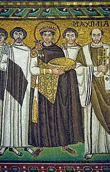 Au sein de l'Horologion de Sainte-Sophie, l'empereur revêt la tunique (le divetesion), brodée bien plus richement que son équivalent antique, à laquelle s'ajoute un manteau, le tzitzakion puis le sagion.