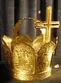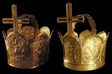 Contrairement à la forme courante de la couronne à onglet pour les couronnes de maison, les deux couronnes sont des répliques de la couronne impériale du Saint-Empire en argent plaqué or. Les deux ont sept plaques reliées avec un étrier de couronne impériale et les deux ont une croix sur la plaque avant. Les figures des deux apôtres Pierre et Paul se trouvent sur deux des panneaux avant. La première couronne, plus grande, a été réalisée par Jakob Philipp Drentwett à Augsbourg. Elle a une hauteur de 25,3 cm et un diamètre de 23 cm et présente des ornements de coquillages, de feuilles et d'ornements. La deuxième couronne, plus petite, a été réalisée par Nikolaus Nell à Francfort-sur-le-Main. Elle a une hauteur de 25,2 cm et un diamètre de 22 cm et montre des vrilles gravées et des ornements de ruban. Les deux couronnes avaient à l'origine des capuchons de couronne et étaient ornées de riches bijoux en pierres précieuses. Le sertissage des pierres précieuses était sous les successeurs, probablement déjà sous Maximilien III Joseph de Bavière, retiré des couronnes et transformé en médailles et bijoux.