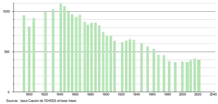 L'évolution du nombre d'habitants est connue à travers les recensements de la population effectués dans la commune depuis 1793. Pour les communes de moins de 10 000 habitants, une enquête de recensement portant sur toute la population est réalisée tous les cinq ans, les populations légales des années intermédiaires étant quant à elles estimées par interpolation ou extrapolation[25]. Pour la commune, le premier recensement exhaustif entrant dans le cadre du nouveau dispositif a été réalisé en 2005[26].