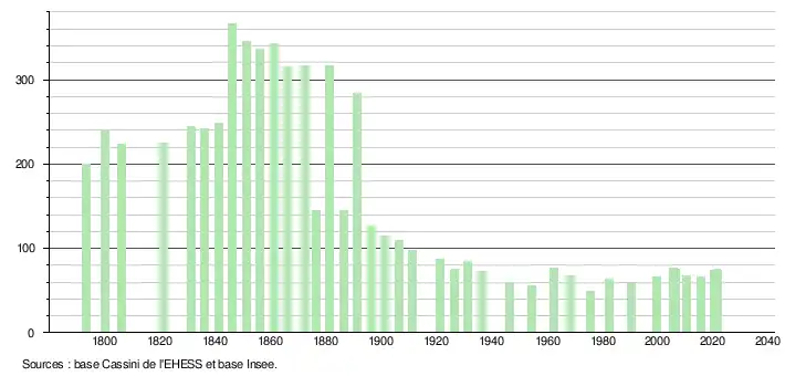 L'évolution du nombre d'habitants est connue à travers les recensements de la population effectués dans la commune depuis 1793. Pour les communes de moins de 10 000 habitants, une enquête de recensement portant sur toute la population est réalisée tous les cinq ans, les populations légales des années intermédiaires étant quant à elles estimées par interpolation ou extrapolation[25]. Pour la commune, le premier recensement exhaustif entrant dans le cadre du nouveau dispositif a été réalisé en 2005[26].