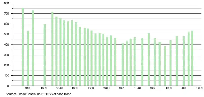 L'évolution du nombre d'habitants est connue à travers les recensements de la population effectués dans la commune depuis 1793. À partir du , les populations légales des communes sont publiées annuellement dans le cadre d'un recensement qui repose désormais sur une collecte d'information annuelle, concernant successivement tous les territoires communaux au cours d'une période de cinq ans. Pour les communes de moins de 10 000 habitants, une enquête de recensement portant sur toute la population est réalisée tous les cinq ans, les populations légales des années intermédiaires étant quant à elles estimées par interpolation ou extrapolation[12]. Pour la commune, le premier recensement exhaustif entrant dans le cadre du nouveau dispositif a été réalisé en 2005[13],[Note 1].