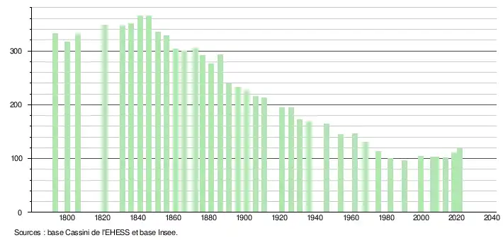 L'évolution du nombre d'habitants est connue à travers les recensements de la population effectués dans la commune depuis 1793. Pour les communes de moins de 10 000 habitants, une enquête de recensement portant sur toute la population est réalisée tous les cinq ans, les populations légales des années intermédiaires étant quant à elles estimées par interpolation ou extrapolation[29]. Pour la commune, le premier recensement exhaustif entrant dans le cadre du nouveau dispositif a été réalisé en 2008[30].