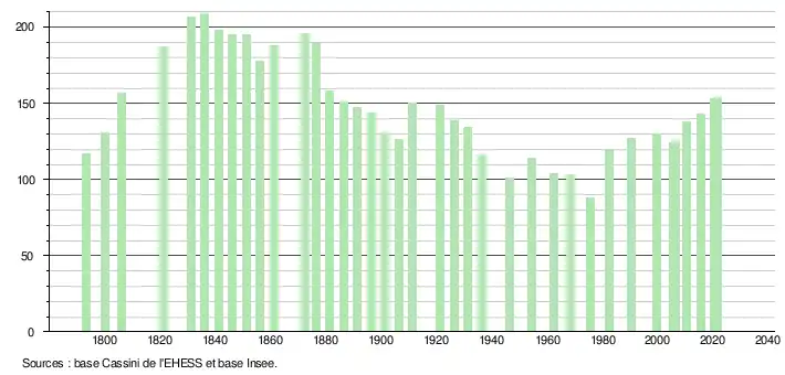 L'évolution du nombre d'habitants est connue à travers les recensements de la population effectués dans la commune depuis 1793. Pour les communes de moins de 10 000 habitants, une enquête de recensement portant sur toute la population est réalisée tous les cinq ans, les populations légales des années intermédiaires étant quant à elles estimées par interpolation ou extrapolation[16]. Pour la commune, le premier recensement exhaustif entrant dans le cadre du nouveau dispositif a été réalisé en 2005[17].