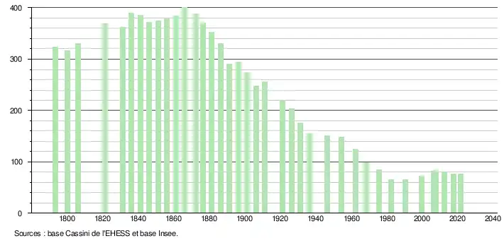L'évolution du nombre d'habitants est connue à travers les recensements de la population effectués dans la commune depuis 1793. Pour les communes de moins de 10 000 habitants, une enquête de recensement portant sur toute la population est réalisée tous les cinq ans, les populations légales des années intermédiaires étant quant à elles estimées par interpolation ou extrapolation[44]. Pour la commune, le premier recensement exhaustif entrant dans le cadre du nouveau dispositif a été réalisé en 2007[45].