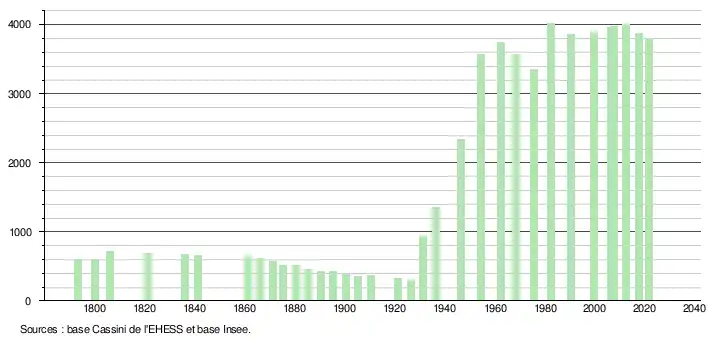 L'évolution du nombre d'habitants est connue à travers les recensements de la population effectués dans la commune depuis 1793. Pour les communes de moins de 10 000 habitants, une enquête de recensement portant sur toute la population est réalisée tous les cinq ans, les populations légales des années intermédiaires étant quant à elles estimées par interpolation ou extrapolation[27]. Pour la commune, le premier recensement exhaustif entrant dans le cadre du nouveau dispositif a été réalisé en 2007[28].