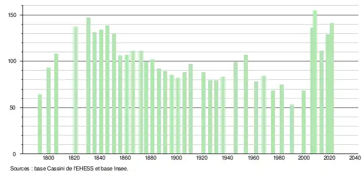 L'évolution du nombre d'habitants est connue à travers les recensements de la population effectués dans la commune depuis 1793. Pour les communes de moins de 10 000 habitants, une enquête de recensement portant sur toute la population est réalisée tous les cinq ans, les populations légales des années intermédiaires étant quant à elles estimées par interpolation ou extrapolation[22]. Pour la commune, le premier recensement exhaustif entrant dans le cadre du nouveau dispositif a été réalisé en 2008[23].
