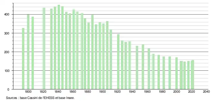 L'évolution du nombre d'habitants est connue à travers les recensements de la population effectués dans la commune depuis 1793. Pour les communes de moins de 10 000 habitants, une enquête de recensement portant sur toute la population est réalisée tous les cinq ans, les populations légales des années intermédiaires étant quant à elles estimées par interpolation ou extrapolation[33]. Pour la commune, le premier recensement exhaustif entrant dans le cadre du nouveau dispositif a été réalisé en 2005[34].