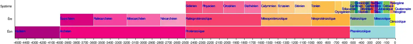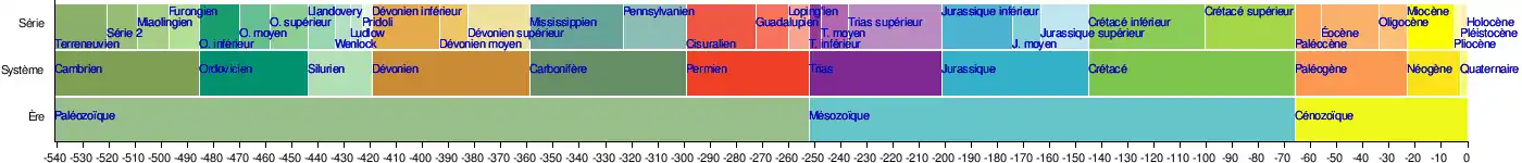 | Cambrien | Ordovicien | Silurien | Dévonien | Carbonifère | Permien | Trias | Jurassique | Crétacé | Paléogène | Néogène | Q. |