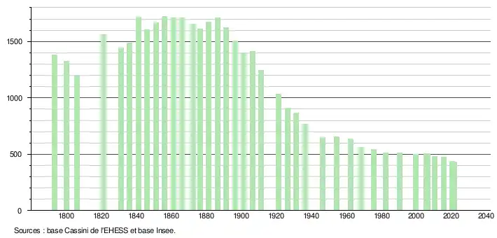 L'évolution du nombre d'habitants est connue à travers les recensements de la population effectués dans la commune depuis 1793. Pour les communes de moins de 10 000 habitants, une enquête de recensement portant sur toute la population est réalisée tous les cinq ans, les populations légales des années intermédiaires étant quant à elles estimées par interpolation ou extrapolation[22]. Pour la commune, le premier recensement exhaustif entrant dans le cadre du nouveau dispositif a été réalisé en 2005[23].