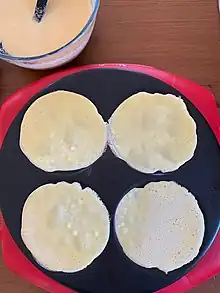 Crêpe en train de cuire : progressivement la pâte se déshydrate (formation de vapeur d'eau[3]), se solidifie (épaississement de l'amidon et coagulation des protéines des œufs et du gluten, formant un gel qui n'est pas perméable à la vapeur d'eau) puis quand elle a perdu une grande partie de son eau, elle dore (plusieurs réactions simultanées de brunissement non enzymatique).