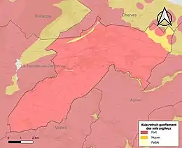 Les mouvements de terrains susceptibles de se produire sur la commune sont des affaissements et effondrements liés aux cavités souterraines (hors mines) et des tassements différentiels[18]. Afin de mieux appréhender le risque d’affaissement de terrain, un inventaire national permet de localiser les éventuelles cavités souterraines sur la commune[19]. Le retrait-gonflement des sols argileux est susceptible d'engendrer des dommages importants aux bâtiments en cas d’alternance de périodes de sécheresse et de pluie[20]. La totalité de la commune est en aléa moyen ou fort (79,5 % au niveau départemental et 48,5 % au niveau national)[Carte 2]. Depuis le , en application de la loi ÉLAN, différentes contraintes s'imposent aux vendeurs, maîtres d'ouvrages ou constructeurs de biens situés dans une zone classée en aléa moyen ou fort[Note 3],[21].