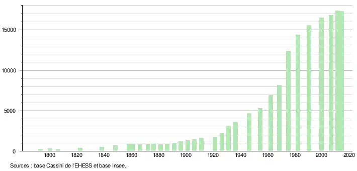 - Par convention dans Wikipédia, le principe a été retenu de n’afficher dans le tableau des recensements et le graphique, pour les populations légales postérieures à 1999, que les populations correspondant à une enquête exhaustive de recensement pour les communes de moins de 10 000 habitants, et que les populations des années 2006, 2011, 2016, etc. pour les communes de plus de 10 000 habitants, ainsi que la dernière population légale publiée par l’Insee pour l'ensemble des communes.