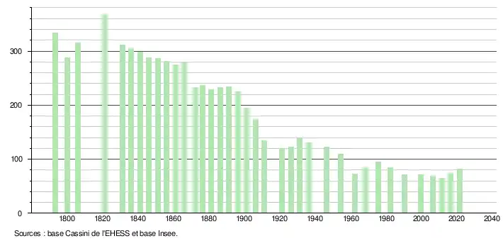 L'évolution du nombre d'habitants est connue à travers les recensements de la population effectués dans la commune depuis 1793. Pour les communes de moins de 10 000 habitants, une enquête de recensement portant sur toute la population est réalisée tous les cinq ans, les populations légales des années intermédiaires étant quant à elles estimées par interpolation ou extrapolation[15]. Pour la commune, le premier recensement exhaustif entrant dans le cadre du nouveau dispositif a été réalisé en 2006[16].