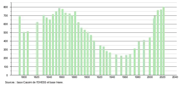 L'évolution du nombre d'habitants est connue à travers les recensements de la population effectués dans la commune depuis 1793. Pour les communes de moins de 10 000 habitants, une enquête de recensement portant sur toute la population est réalisée tous les cinq ans, les populations légales des années intermédiaires étant quant à elles estimées par interpolation ou extrapolation[34]. Pour la commune, le premier recensement exhaustif entrant dans le cadre du nouveau dispositif a été réalisé en 2007[35].