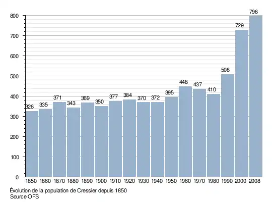 Le graphique suivant résume l'évolution de la population de Cressier entre 1850 et 2008[3] :