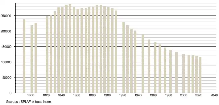 - Population municipale légale en vigueur au 1er janvier 2024, millésimée 2021, définie dans les limites territoriales en vigueur au 1er janvier 2023, date de référence statistique : 1er janvier 2021.