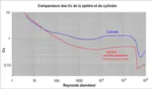 Clift, Grace et Weber[6] ont établi une courbe « standard » du de la sphère sur toute la plage de Reynolds possibles ; cette courbe est composée de dix régressions mathématiques simples (courbe rouge du graphe ci-contre].