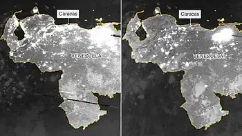 Le 7 mars, une panne d'électricité de grande ampleur touche le Venezuela. Une grande partie du pays est dans le noir complet. Le gouvernement dénonce une « guerre de l'électricité » et un « sabotage ». La centrale hydroélectrique de Guri est attaquée d'après le ministre de l'Énergie électrique, Luis Motta. Maduro accuse de son côté les États-Unis en déclarant sur Twitter que « la guerre de l'électricité annoncée et dirigée par l'impérialisme américain contre notre peuple sera mise en échec. Rien ni personne ne pourra vaincre le peuple de Bolivar et de Chávez. Patriotes, unissez-vous! ». Guaidó de son côté tweete « plus de six heures sans lumière à Caracas, c'est un record. Chaos, inquiétude, indignation. Cette panne témoigne de l'inefficacité de l'usurpateur. La renaissance du circuit électrique et celle du pays passent par la fin de l'usurpation »[98],[99].