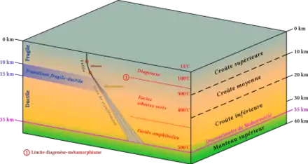 Par rapport aux déformations géologiques, la zone supérieure est plus fragile, et la zone sous-jacente plus ductile. Dans la zone ductile, la croûte terrestre peut se déformer plastiquement, c'est-à-dire sans se rompre et de façon permanente. À une profondeur d'environ 10 à 20 km, la pression et la température sont en effet si élevées que les principaux composants minéraux de la croûte, du quartz et du feldspath ne réagissent plus en cassant lorsqu'ils sont soumis à des contraintes tectoniques, mais réagissent de manière ductiles, par glissement aux limites des cristaux ou en recristallisant. La profondeur de cette zone de transition dépend du flux de chaleur et de la teneur en fluide de la croûte terrestre. Dans les régions magmatiquement actives avec un flux de chaleur accru et une concentration de fluide plus élevée, la zone ductile commence à une profondeur plus faible, ce qui rend la croûte terrestre plus facilement déformable.