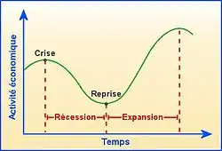 À court terme, les économistes utilisent plutôt le terme d'« expansion », qui s'oppose à « récession », et qui indique une phase de croissance dans un cycle économique. La croissance potentielle est le niveau de croissance qui serait obtenu avec une pleine utilisation de tous les facteurs de production (travail, capital et savoir) ; l'écart entre la croissance effective (celle effectivement mesurée) et la croissance potentielle est minimal au plus fort d'une expansion.