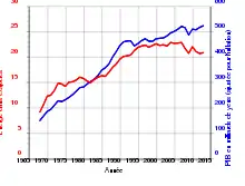 • le PIB ne mesure que de façon imparfaite les productions qui ne sont pas commercialisées : ainsi, la production des administrations est supposée égale aux salaires des fonctionnaires ; une évaluation des productions agricoles auto-consommées est intégrée au PIB[6]. D'autre part, même s'il prend en compte la production des activités non marchandes, le PIB ne mesure pas l'activité de production domestique (ménage, cuisine, bricolage, éducation des enfants, etc.)[6], des activités majoritairement réalisées par des femmes[7],[Note 2]. En 2009, la commission Stiglitz-Sen-Fitoussi estime que la valeur du travail domestique équivaut à 35 % du PIB en France sur la période 1995-2006[7] ;